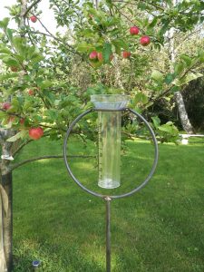 Regnmätare – Cirkel En stilren regnmätare att förgylla trädgården med. Höjd: ca 120cm Diameter: ca 18cm Material: 6mm rundstång, 8mm rundstång, mätglas i plast. Regnmätaren kommer att få en rostig yta när den placeras utomhus. Pris: 400kr Tillbaka