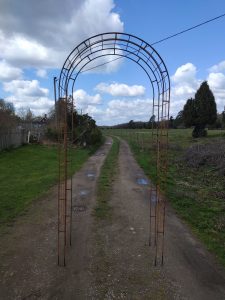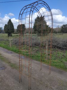 Rosenbåge – Kupol En stilren rosenbåge att förgylla trädgården med. Höjd: ca 260cm Bredd: ca 120cm Djup: ca 45cm Material: Rosenbågen är tillverkad i 10mm armeringsjärn och 5mm armeringsnät med 150mm rutor.Rosenbågen har en rostig yta. Pris: 2500kr Tillbaka