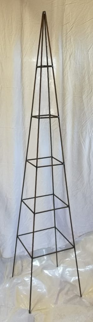 Växtstöd – Pyramid Höjd: ca 190cmBredd: ca 35cm Material:8mm armeringsjärn med rostig yta Pris: 550kr Tillbaka